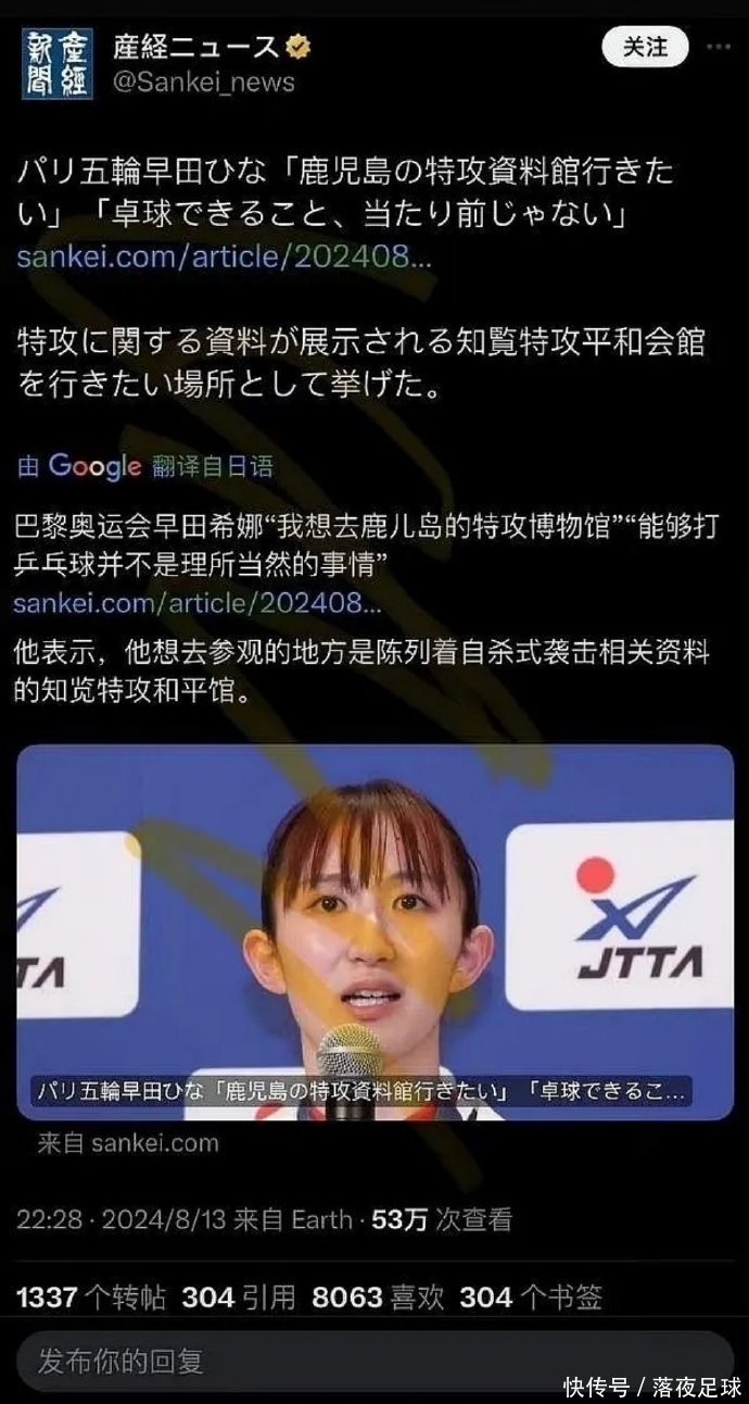 辩论词,好景不常,早田希娜在归国后的一次采访中,抒发了我方思要参不雅鹿儿岛二战手艺日本神风特工队贵寓馆的意愿。这一言论飞速激发争议,被以为涉及了历史明锐问题,也涉及了孙颖莎及繁密中国球迷的底线。在此配景下,孙颖莎鉴定禁受动作,飞速取消了对早田希娜的轻柔,用本色动作标明了我方的态度和气魄。