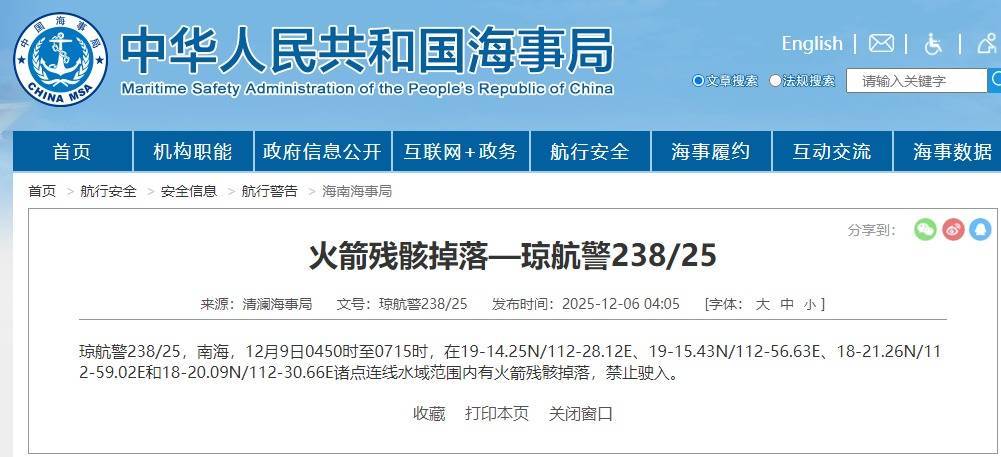 据中国海事局网站讯息,清澜海事局发布飘动造就,12月9日4时50分至7时15分,南海部分水域限制内有火箭遗残掉落,辞让驶入。